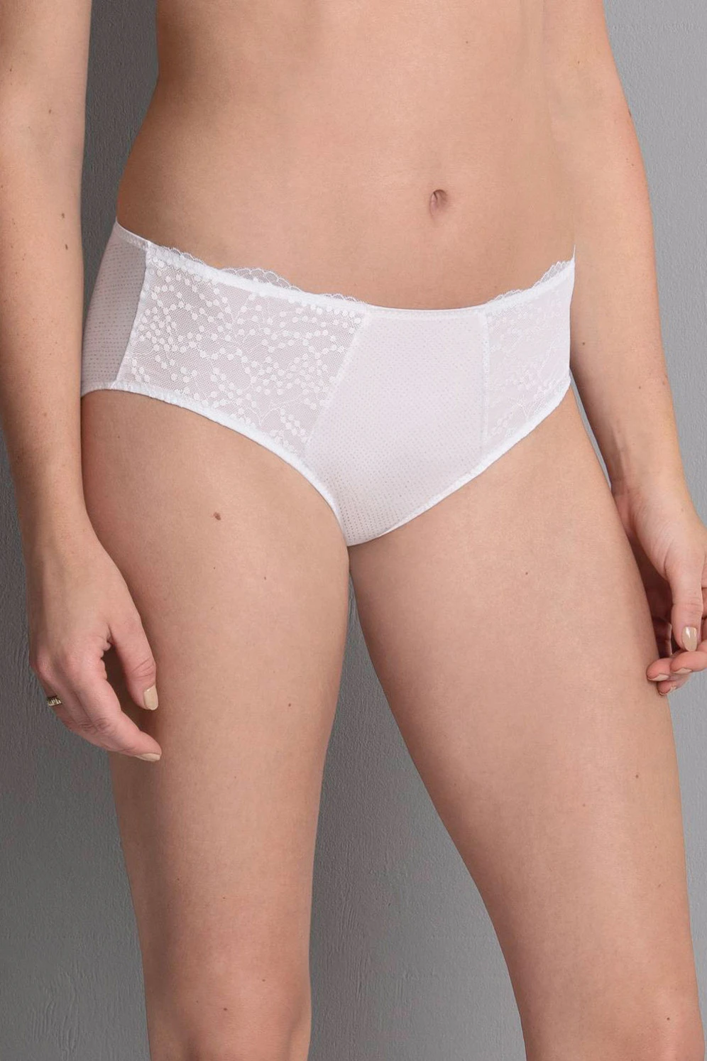 Der Taillenslip fällt vergleichsweise wenig hoch aus. Er vereint hübschen Pünktchenstoff seitlich mit unterlegter Spitze, die in Bögen leicht übersteht. Auf ein extra Bündchen wird verzichtet. Die Beinöffnungen sind mit kleinen Zickzackstichen versäumt.