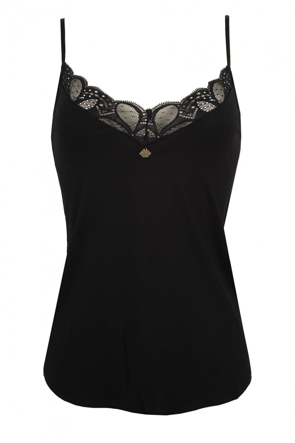 Top mit schmalen Trägern. Ein flacher V-Ausschnitt ist mit wunderschöner Spitze reizvoll veredelt. Durch deren Transparenzen zeichnen sich die Wölbungen der Brüste ahnungsvoll ab. Weicher opaker Modalstoff mit Elasthananteil umschmeichelt den Oberkörper. Das Modell zeigt am gerade abschließenden Rücken nochmals kleine Spitzendreiecke an den Trägeransätzen. Als Kombipartner zu einem der sexy Höschen dieser Kollektion unschlagbar!