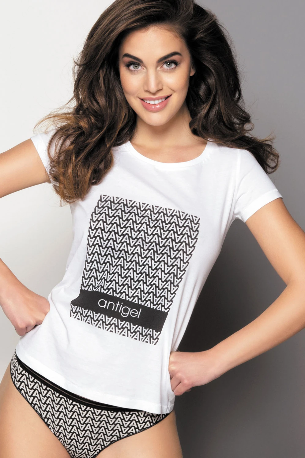 Feminines Shirt aus reiner Baumwolle. Es hat einen bequemen Rundhalsausschnitt und kleine anliegende Kurzärmel. Das Modell wird dank seines rechteckigen Druckmotivs auf der Vorderseite zum aufregenden Blickfang: Die Marke Antigel zeigt sich anlässlich ihres 20. Geburtstages mit Schriftzug und einem Musterausschnitt, der dem Buchstaben A die Ehre erweist.