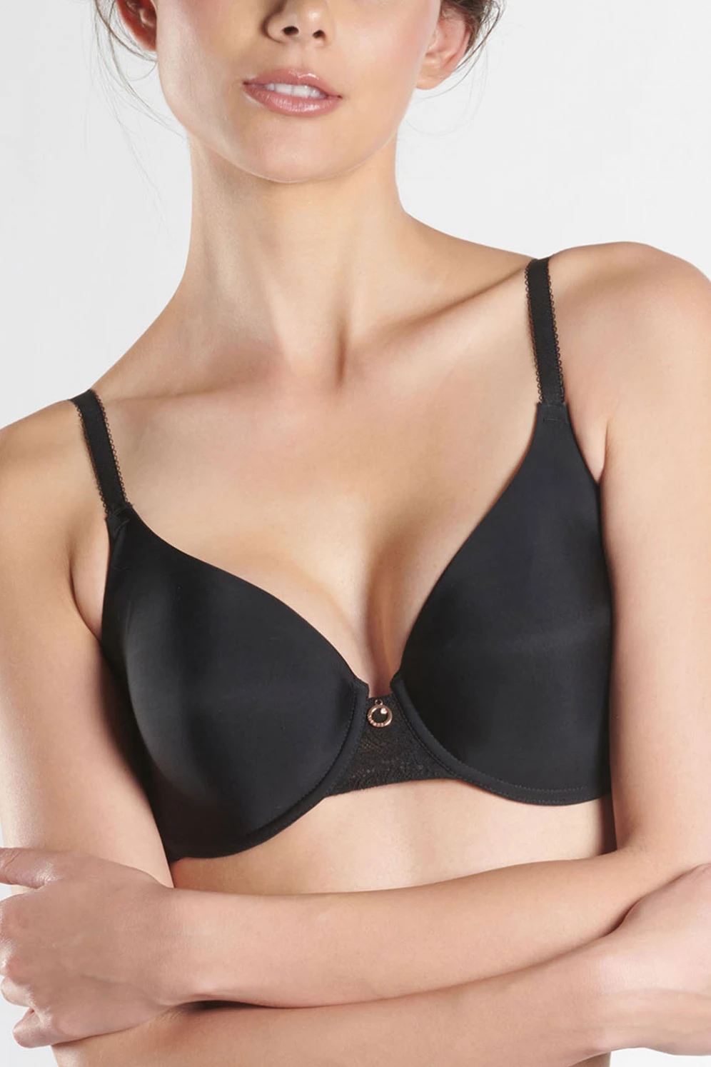 Schalen-BH mit Cups aus gemoldeter Wirkware – ein wunderbar leichtes Dessous für den Alltag und jede Garderobe. Sein herzförmiges Dekolleté wird durch schmale Zierpicot-Träger und den hübschen, leicht vertieften Steg mit Goldring veredelt. Die Konstruktion baut auf klassische Lycraspitze mit strukturiertem Rosenmuster und weist eine sogenannte Eiffelturm-Rückseite auf. Ein sehr hübsches Modell – zeitlos, natürlich, sinnlich.