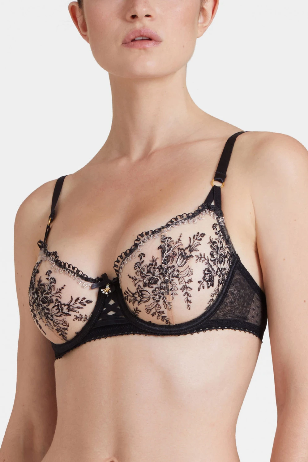 Dieser Halbschalen-BH mit Bügeln zeigt raffinierte Zierden durch Lycra- und Lurexgarne. An den Körbchen lässt zarteste Stickerei auf unsichtbarem Tüll die grazilen floralen Details wie Tattoos wirken. Aufwendig ist der Steg gestaltet: Eine Schnürung bildet ein Karogitter und unter dem grazilen Schleifchen funkelt ein fächerförmiger Anhänger. Schlaufen und Picotborte zieren die Ränder. Interessante Trägeransätze sowohl an der Vorderseite als auch am Rücken sowie goldene Ösen runden das extravagante Design ab.