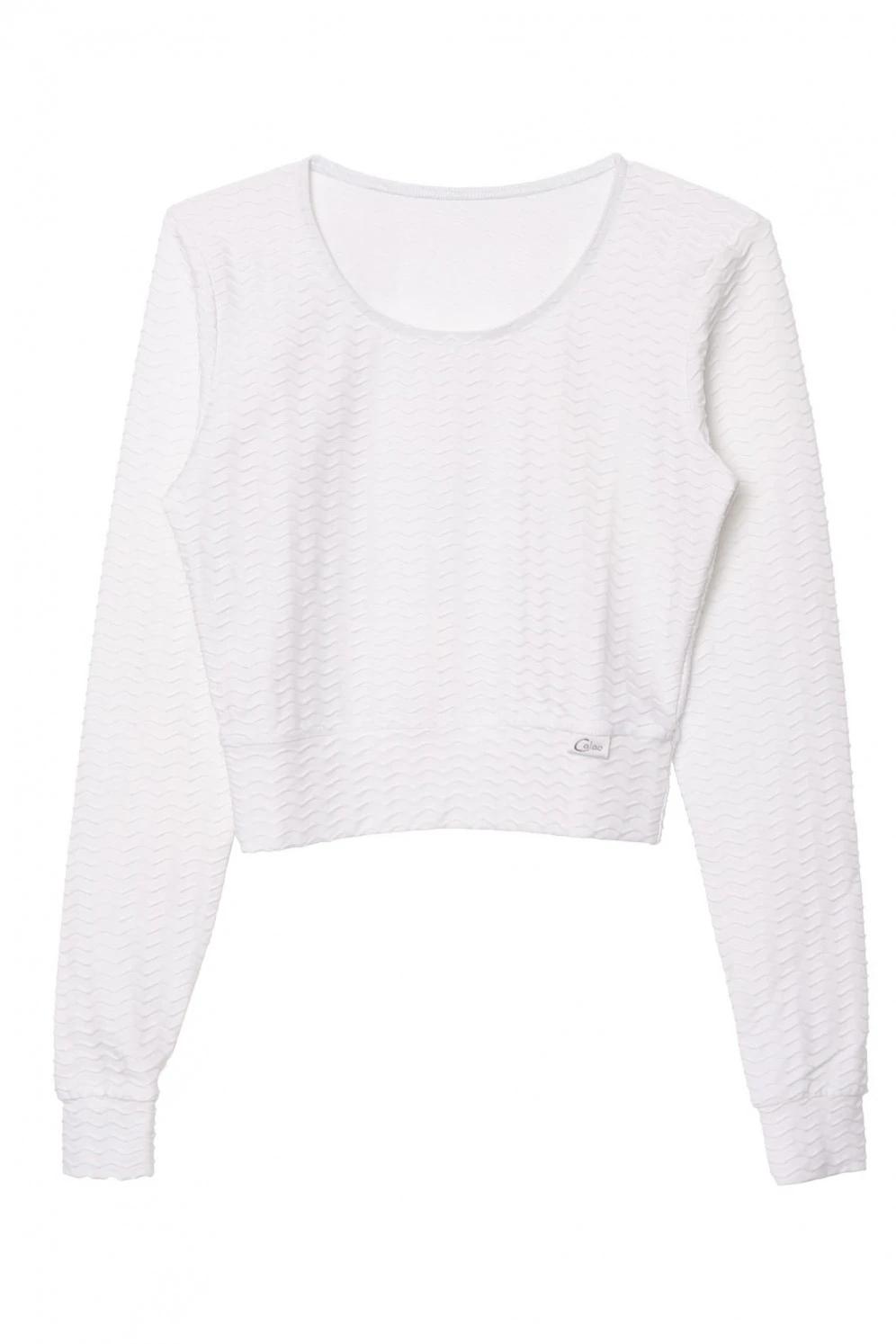 In modischer Kurzform mit langem Ärmel ist dieses angesagte weiße Crop-Top der Marke Calao gehalten. Perfekt zum Aufwärmen beim Sport oder zum einfachen Überziehen in Kombination mit einer Leggings aus der Kollektion. Ein hübscher femininer Look gelingt ebenso zur Jeans! Das mit einer großflächigen Wellenstruktur gemusterte Modell hat einen Rundhalsausschnitt, breite Ärmelbündchen für perfekten Sitz und schließt mit einem extra breiten, gedoppelten Abschlussbund unter der Brust ab. Schauen Sie genau hin… ein raffiniertes Must-have, was sich sehen lassen kann!