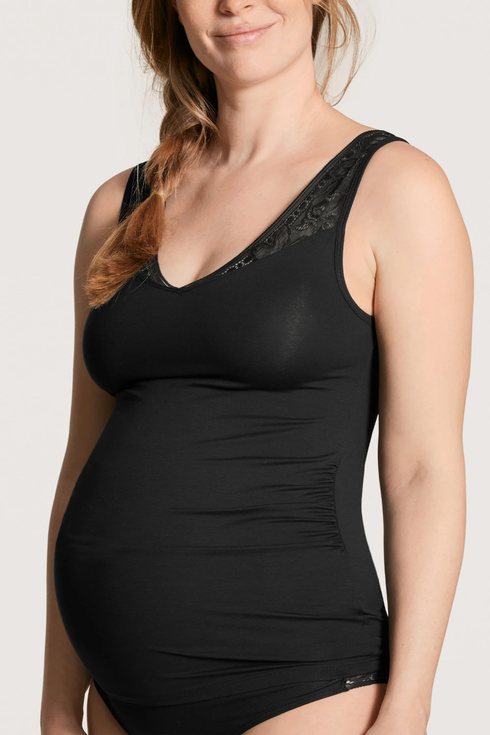 Wunderbares Tank Top für die werdende Mutter. Die Gestaltung der Träger am Dekolleté zeugt von liebevollen Ideen. So beginnen im angedeuteten V-Ausschnitt Spitzenpassen, die sich bis zu den Schultern erstrecken und sowohl florale als auch grafische Muster zeigen. Im Übrigen gefällt das Modell durch seinen Stoff: feines dichtes und dehnbares Micro-Lyocell. An den Seitennähten sind auf den mittleren Abschnitten Raffungen berücksichtigt, die dem wachsenden Bauch genug Bedeckung gewähren. Der Rücken ist mit rundem Ausschnitt gestaltet, Einfassungen und Abschlüsse sind mit Zwillingsnähten ausgeführt. Dieses Hemdchen ist ein Must-have!