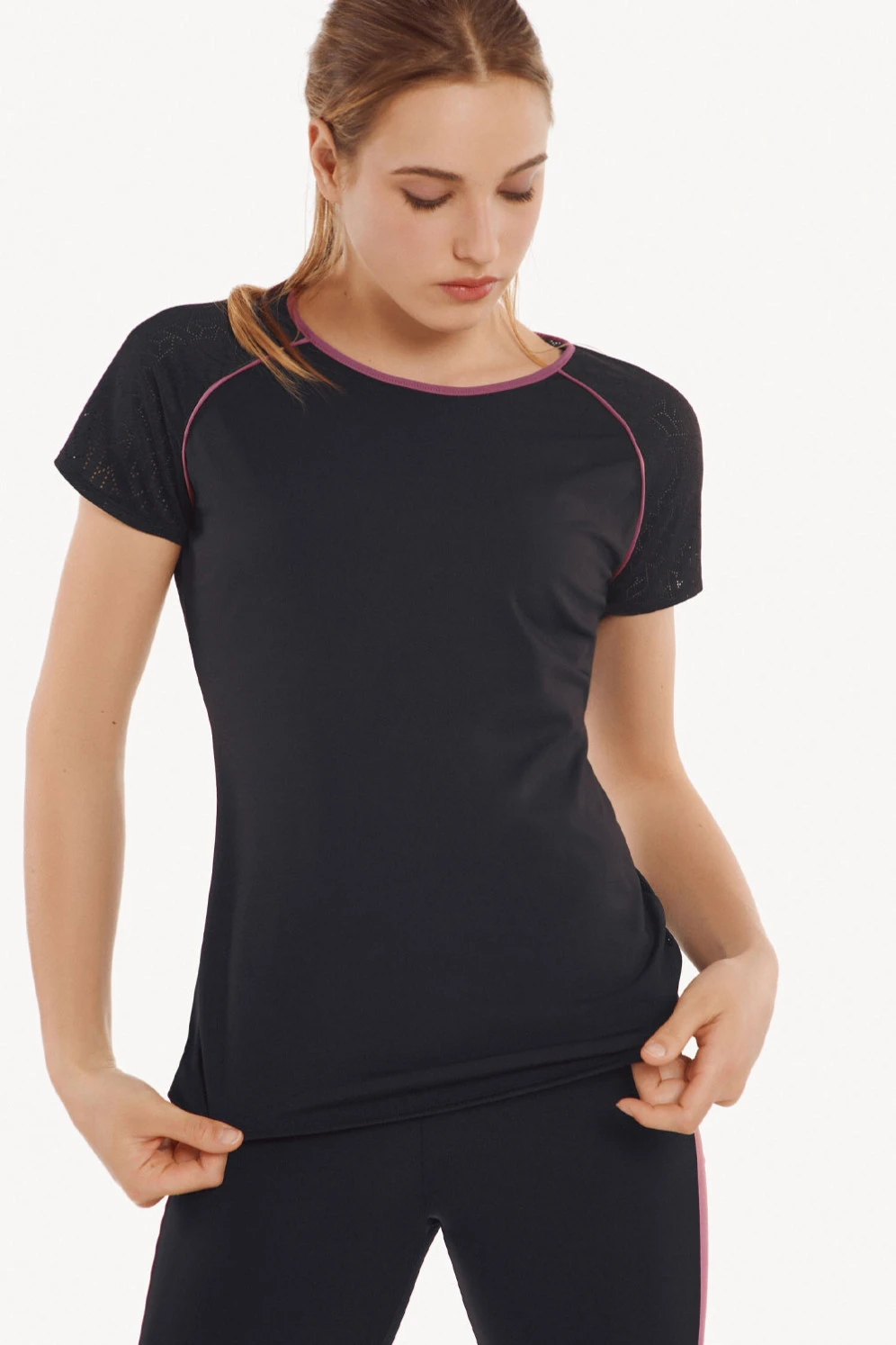 Kurzarm-Shirt für viele Bewegungs- und Sportarten. Die vorteilhafte Verwendung von zart geometrisch perforiertem Stoff sorgt für Luftzirkulation im gesamten Schulter- und Rückenbereich. Dagegen bleibt die Vorderseite opak. Hübsch sind die Raglanärmel vorn mit der Zweitfarbe abgesetzt, genauso wie die Rundhalsöffnung. Das Shirt ist leicht tailliert geschnitten und unten sowie an den Ärmeln rundum sauber versäumt.