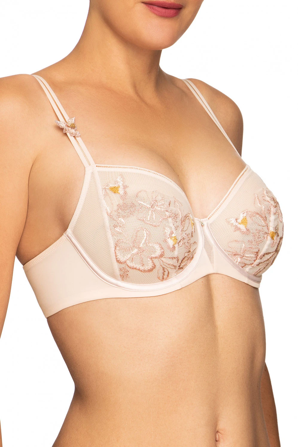 Herrlich leichter Bügel-BH, der liebevoll kreiert und gefertigt ist und dank Pastelltönen auf Frühling und Sommer einstimmt. Sanft schimmert schmales Satin-Bügelband neben feiner Mikrofaser und mehrfarbig bestickten Cups. Diese sind mit Seitensichel genäht und bestehen aus einem sehr zarten gedoppelten Wabentüll. Am Steg glitzert ein Schmucksteinchen, entlang des Dekolletéabschlusses und an den Trägern wirken die transparenten Details als anmutige Linien. Das duftige Modell aus weichen Materialien schmückt ein Guipuremotiv in Form eines Kolibris. Sein Miederrücken und verstellbare Schulterbänder machen es höchst komfortabel.