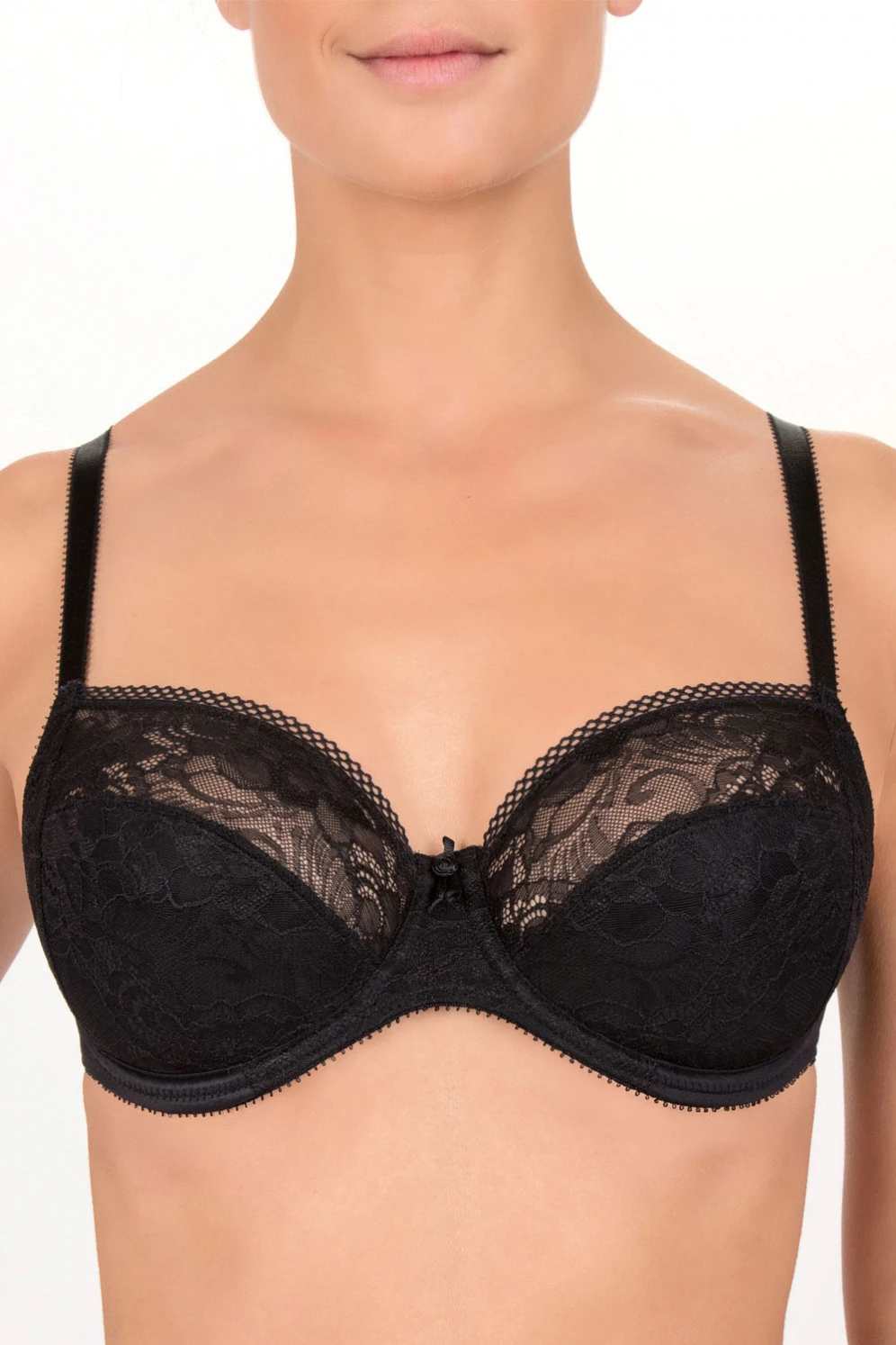 Dieser Bügel-BH bietet komfortablen Halt durch die Kaschierung im Untercup sowie die eingearbeiteten Seitensichel. Dadurch erhält die Büste eine zentrierte, gleichförmige Präsenz, verführerisch blitzt die Haut durchs Obercup. Spitze allover in femininer, anschmiegsamer Blütenoptik überzieht die Körbchen und ist durch moderne Netzabschlüsse am Dekolleté abgerundet. Ein Schnürchen-Knopf-Detail zieht die Blicke mittig zum taillierten Steg. Schmale Träger münden am Rücken in eine leichte Miederform – für einen stabilen, angenehmen Sitz.