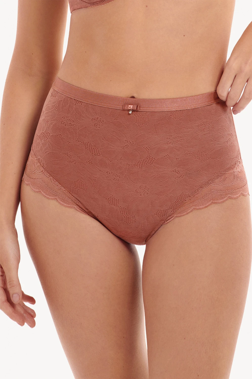 Dieser hohe Lisca Slip gewährt hohen Alltagskomfort bis Konfektionsgröße 50! Er ist funktionell und kaschiert zugleich kleinere Problemzonen, zeigt sich mit einer wunderschönen Kombination aus Spitzenstoff, vorn diskret mit Tüll unterlegt, und geschmeidiger Wirkware. Nahtlose Randbesätze am Beinausschnitt sorgen für sanftes und unsichtbares Tragen. Der obere Abschluss mit dem flachen und modernen, dezent schimmendern Elastikband garantiert völlige Bewegungsfreiheit, ein zartes Schleifchen mit funkelndem Strassstein ist liebevolle Zierde.
