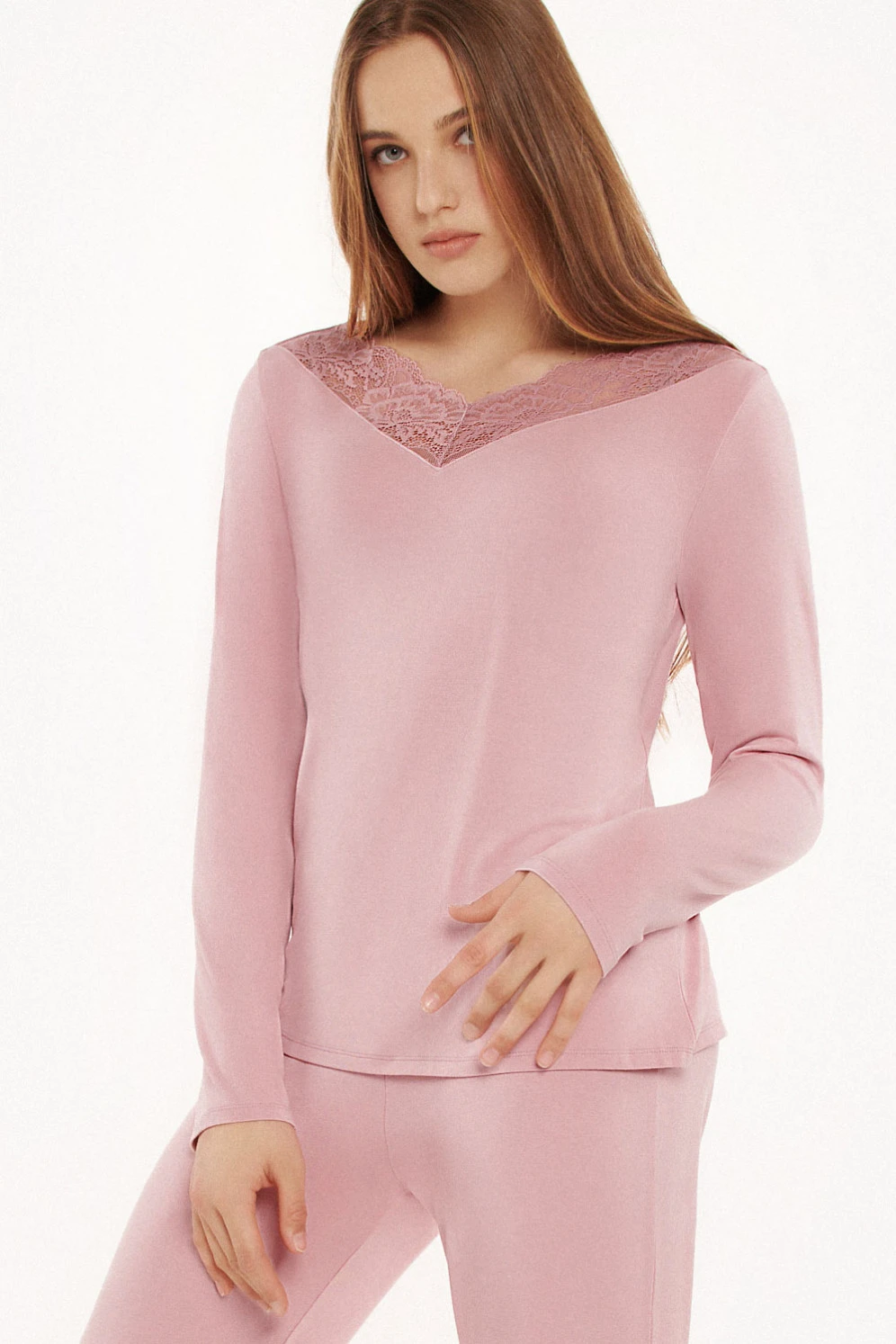 Wunderschön fallendes Langarm-Shirt in leger klassischer Schnittinterpretation. Zarte Fantasiespitze zeichnet am Dekolleté florale Muster auf die Haut. Das Oberteil umspielt mit weichem Modalstoff sanft den Körper. Es schließt entlang des Nackens mit einer Einfassung ab, unten ist es gerade versäumt. Durch den V-Ausschnitt wirkt es elegant. Zwei ähnliche Farbstellungen lassen viele Kombinationsmöglichkeiten offen: eine unifarbene in sanftem Rosenton und eine mit pudrig bedrucktem Gewirk und rosenfarbener Spitze.