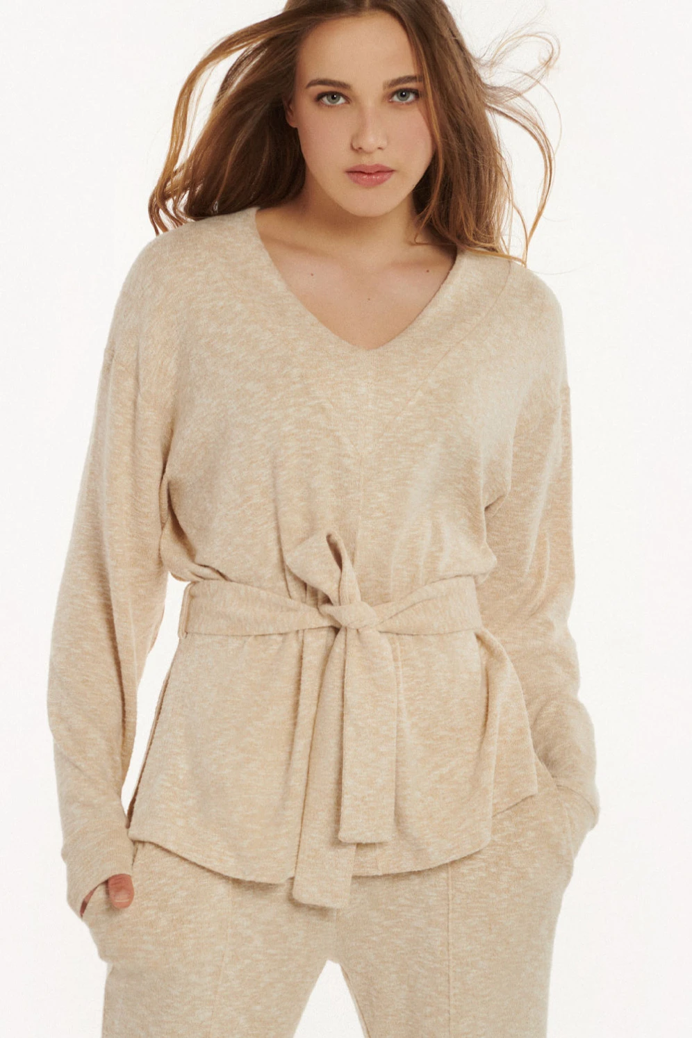 Dieses legere V-Shirt eignet sich perfekt für freie Zeit, die zu Hause verbracht wird. Sein leichtes weiches Strickmaterial im Mix aus verschiedenen Fasern vermittelt ein Relaxgefühl. Die beige-weiß melierte Farbgebung wirkt ruhig und besänftigend. Der hübsche, breit gefasste Ausschnitt, die mittigen Vertikalnähte und der taillierte Schnitt umreißen eine feminine Silhouette. Überschnittene Schultern machen den Pulli im Handling unkompliziert und dank seiner Ärmelbündchen vermag er zu wärmen. Ein langes breites Gürtelband kann optional verwendet werden, als Schmuck oder um die Taille zu betonen.
