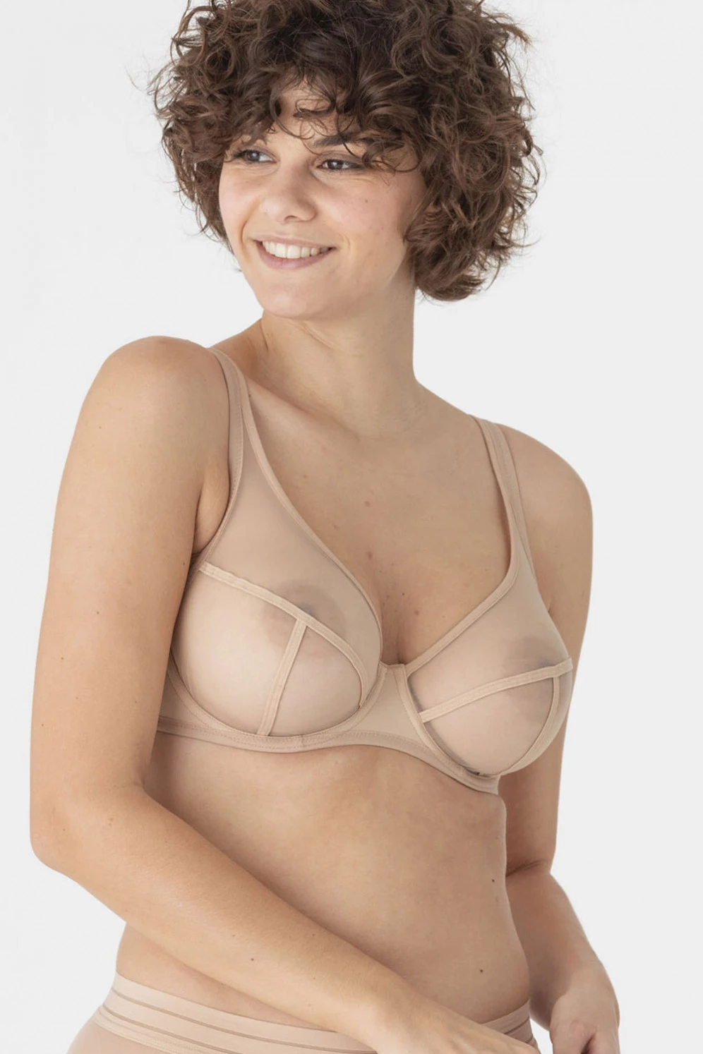 Der Vollschalen-BH von Maison Lejaby+ im modernen „sporty-chic“ Stil mit transparentem Tüll, akzentuiert und betont durch grafisches Satinband, setzt das Dekolleté verführerisch in Szene. Er verfügt über 3-geteilte Körbchen mit aufsteigender Quernaht in Verlängerung des Trägers, um die Brust optimal zu umschließen und zu halten. Somit verleiht Ihnen das Dessous eine natürliche Brustform und gibt perfekten Halt in großen Größen. Alle Nähte sind sehr flach ausgeführt, sodass sich unter der Kleidung nichts abzeichnet. Die seriencharakteristischen 3 Streifen-Aufnäher sind auf den BH-Seitenstegen platziert, die Rückenpartie ist aus solidem, haltgebendem Strickmaterial gearbeitet.