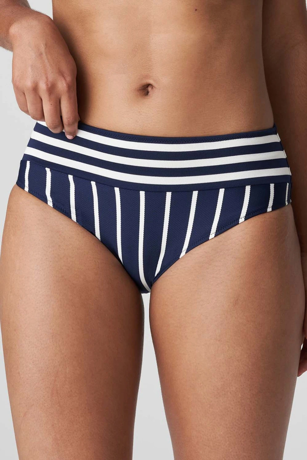 Bikini-Taillenslip – unkompliziert und praktisch, mit guter Seitenhöhe und moderater Bedeckung. Seine Wirkung resultiert aus der Anordnung des maritimen Streifenstoffs: Der breite Bund setzt sich schön ab. Das robuste Recyclingmaterial in dunklem Blau und strahlendem Weiß ist mit Innenfutter und kleinen Zickzacknähten dehnbar verarbeitet. Ein zeitloses Höschen fürs Badengehen!