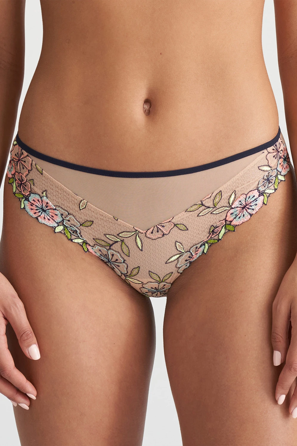 Zarter Rioslip, vorn zusammengesetzt aus Passen weichen Tüll- und Netzmaterials, das zum Teil wunderhübsch mit Blüten bestickt ist. Ein breiter Dreieckseinsatz unterhalb des sehr schmalen Kontrastbündchens zeichnet die Körperform ansprechend nach. Das knappe Rückenteil besteht aus feinem Mikrofaserstoff und ist entlang der Ränder umgeschlagen sowie mittels Zickzacknaht versteppt. Ein Höschen mit tollen Trageeigenschaften.
