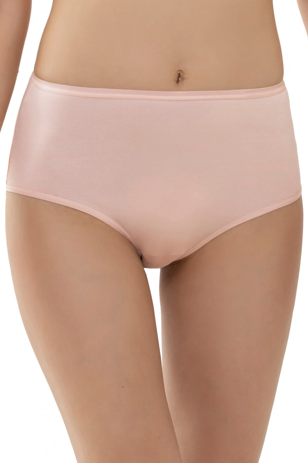 Bequemes dehnfähiges Taillenhöschen, das den Po vollständig umschließen kann. Es besteht aus opakem, geschmeidig weichem Material, ist als besonders atmungsaktiv ausgewiesen und schmiegt sich wie eine zweite Haut an den Körper. Ein flaches Bündchen wurde elastisch mittels doppelter Naht angesetzt, die Beinränder sind mittels Kettstichen sehr flach versteppt. Eleganterweise zeigt sich vorn am Zwickel keine Naht.
