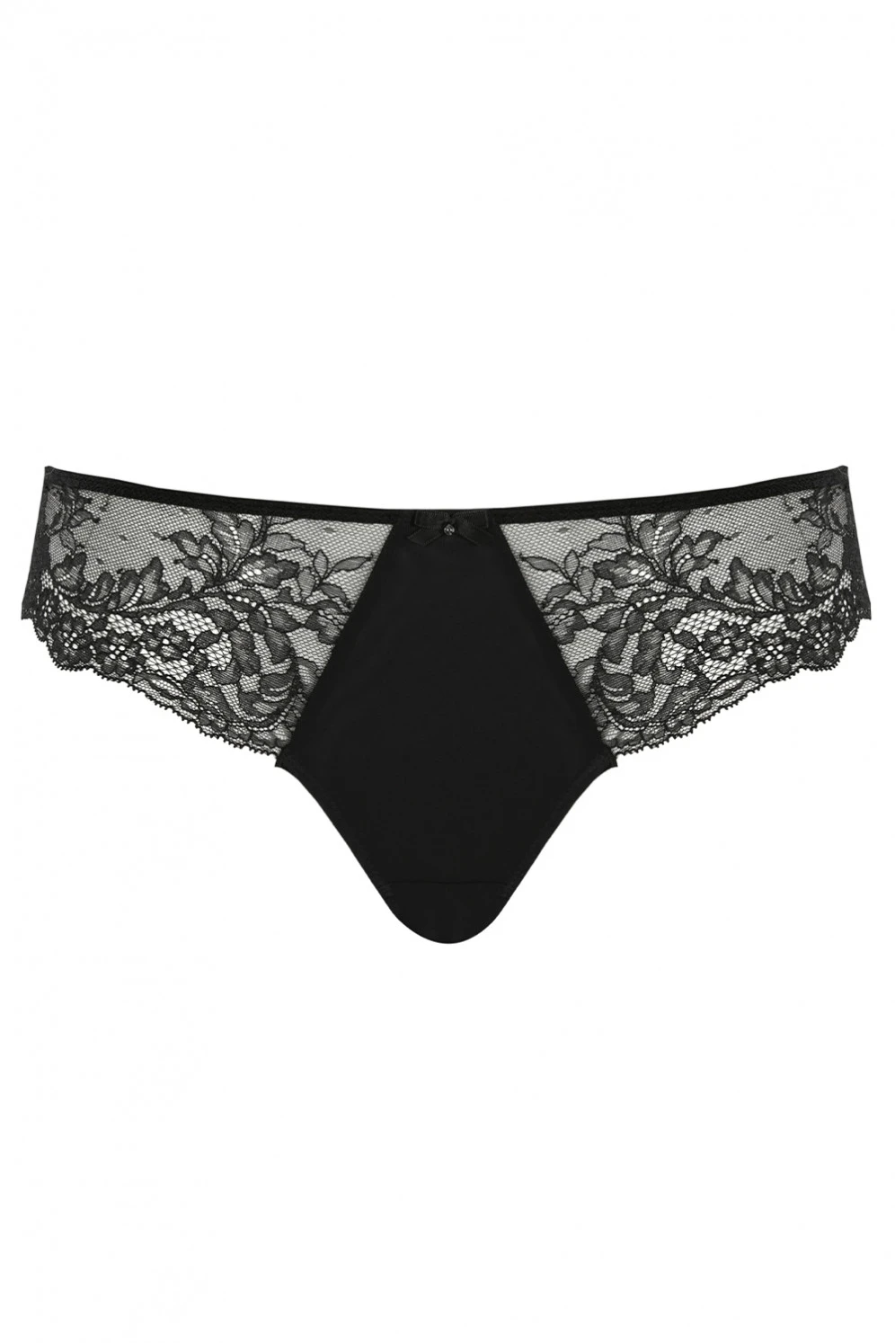 Verführerischer String aus viel zarter Musterspitze, die ihre fantasiereichen floralen Gebilde wunderschön über der Haut abzeichnet. Das zarte Stretchmaterial schmiegt sich an die Formen und zeigt überdies kleine Pünktchen im Tüll. Ein graziler Umschlag bildet die konturierende Bundlinie. Das Dessous integriert vorn eine schmal ausgeführte opake Passe, die oben mit einem koketten Satinschleifchen verziert ist.