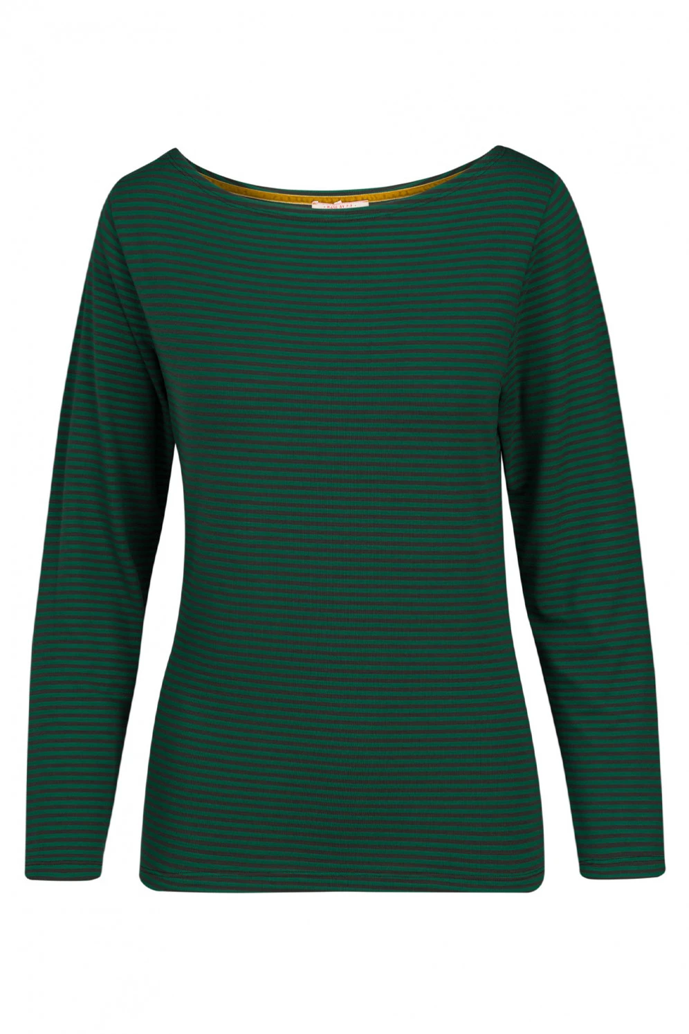 Langärmeliges Shirt mit weitem Hals-Schulter-Ausschnitt, welcher mittels Doppelnaht versäumt und im Nacken unterlegt ist. Die leicht überschnittene Schulterpartie bedingt frauliches Volumen, ohne zu leger zu sein, lange Ärmel schmiegen sich an. Der wunderbare dehnfähige Viskosestoff zeigt sich fein geringelt – ein Dessin, das immer gut aussieht. Am oberen Rücken leuchtet ein kleines Pip-Label. Erhältlich in zwei Farbstellungen.