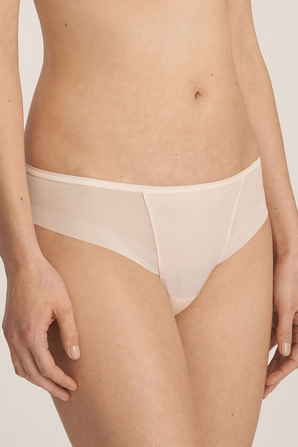 Sich ganz flach an den Körper schmiegender leichter String, gefertigt aus doppellagigem – an den Beinrändern umgeschlagenen – Tüll sowie glattem Dessousmaterial. Die Passe verläuft, sich leicht verbreiternd, zum sehr schmalen, wie eine Paspel angesetzten Bündchen. Das schlichte Design verleiht dem gesamten Höschen enorme Eleganz!