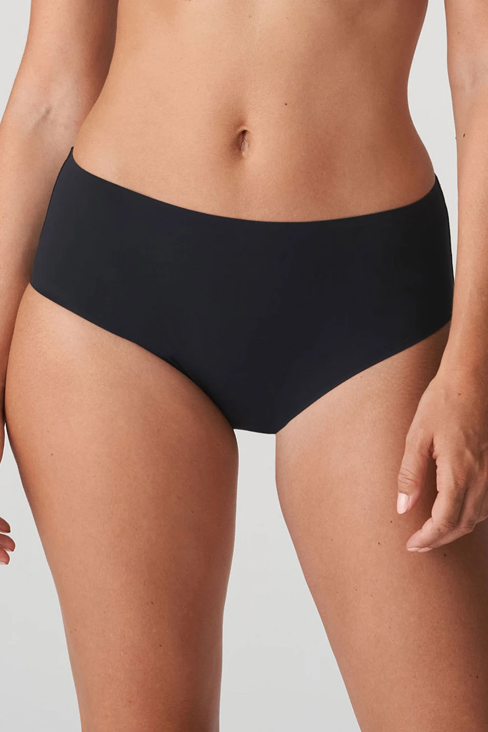 Mäßig hoher Taillenslip mit einem eher knappen Schnitt am Rücken. Elegant sind die Abschlüsse verarbeitet: Sie sind nach innen umgeschlagen und verklebt und bilden somit glatte saubere Ränder. Die seitlichen Nähte sind besonders dezent und stabil. Das dünne, aber opake Dessousmaterial dieses absolut puristischen Modells schmiegt sich weich an die Haut – für ein famoses Tragegefühl.