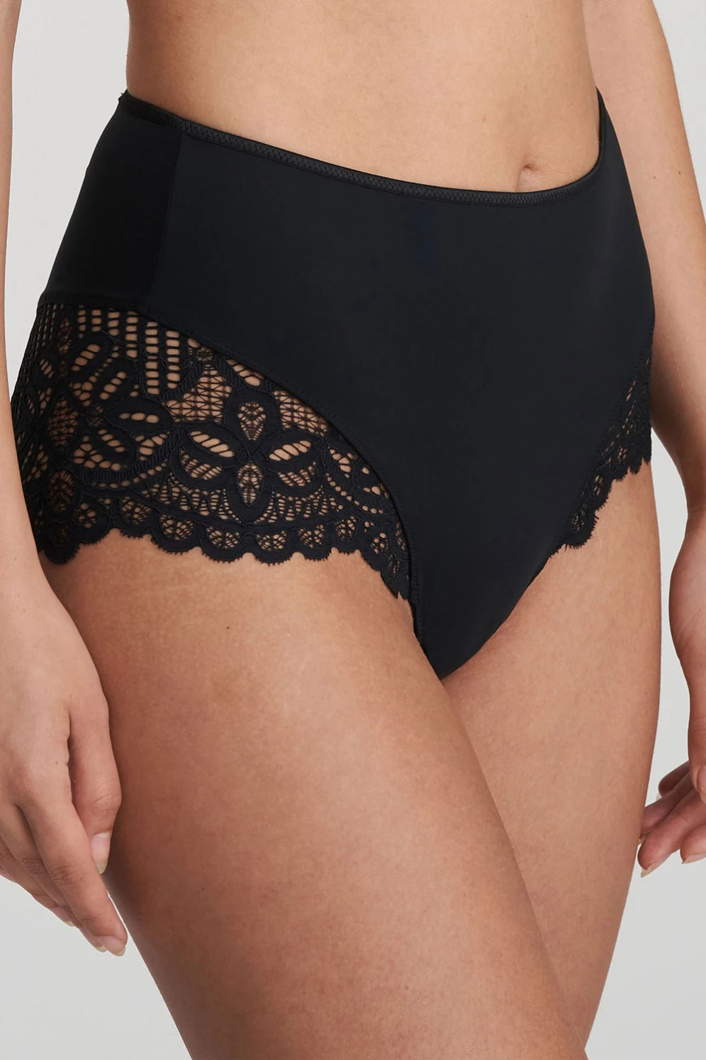 Bei diesem ausdrucksvollen Taillenslip kommt neben dichtem opaken Material viel dekorative, weil grafisch kleinteilig gemusterte Spitze zum Einsatz – in Form breiter Streifen in den Beinausschnitten, von vorn bis über den Po, wo sie in vertikaler Naht aufeinandertreffen. Oberhalb der glatten elastischen Rückenpartie ist zusätzlich ein Zierdetail mit Ringlein eingearbeitet. Das temperamentvolle Höschen reicht etwa bis zum Nabel und weist vorn ein gut bedeckendes Stoffdreieck auf. Bund und Stoffübergänge sind sehr schmal und ebenfalls elastisch ausgeführt.