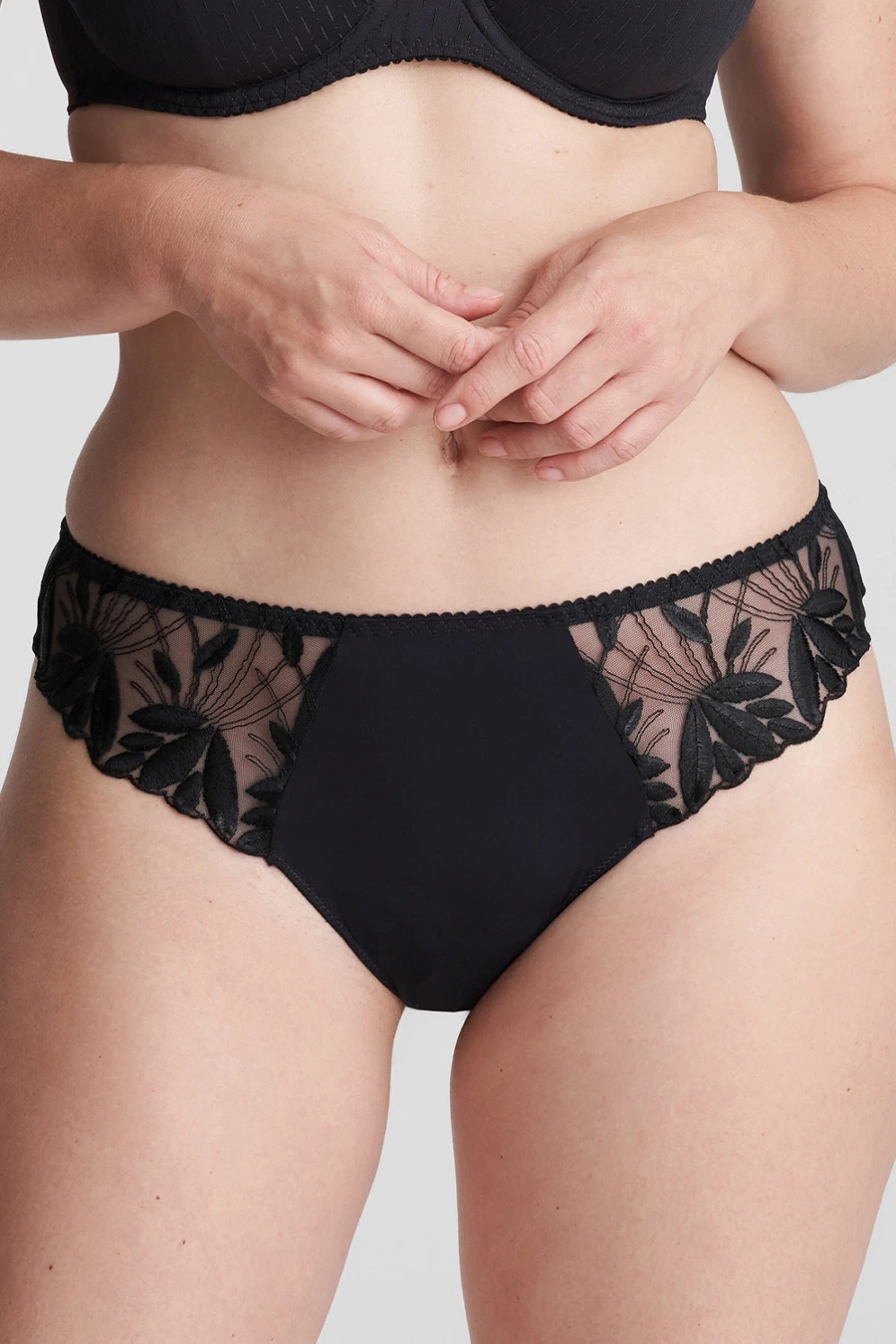 Sich soft anschmiegender String aus leichten Dessousmaterialien. Die vorn seitlich dezent eingearbeiteten bestickten Tüllpassen begeistern mit ihrem Blattmuster sowie dem Glanz, der von den verwendeten Garnen ausgeht. Die Beinränder weisen ganz schmale Ziernähte auf, entlang des Bundes ist das Höschen mit weicher Bogenpaspel elastisch versteppt. Dank seiner Seitenhöhe von etwa 5 Zentimetern fällt die Bedeckung moderat aus, was vielen Frauen gefallen dürfte.