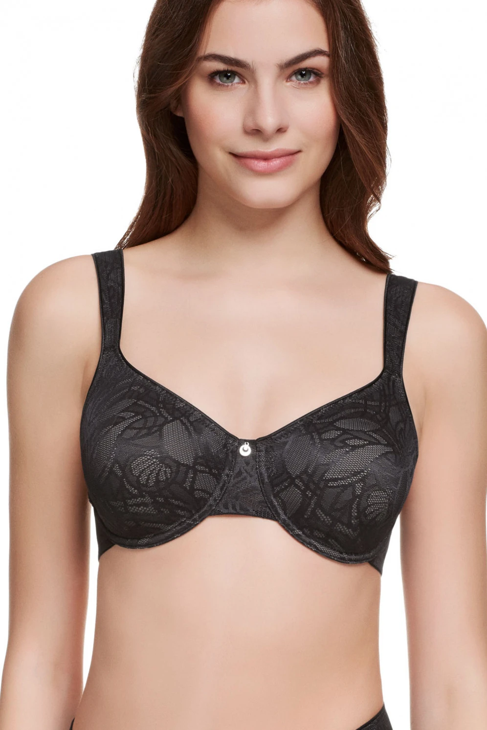Der gemoldete BH ist auf Bügeln gearbeitet und definiert gleichmäßige runde Brüste. Ganz mit flacher Spitze überzogen präsentiert sich die Gestaltung, am Dekolleté und an den Armausschnitten befindet sich feine Paspelierung. Den zwischengesetzten Steg ziert ein kreisförmiges Accessoire. Über den Schultern sind die Träger verbreitert. Sie gehen aus den Cups hervor, was einen erhöhten Komfort schafft. Dank der filigranen Musterung des wunderschönen Ajourgewebes entsteht ein gefälliger, sehr ästhetischer und moderner Look.