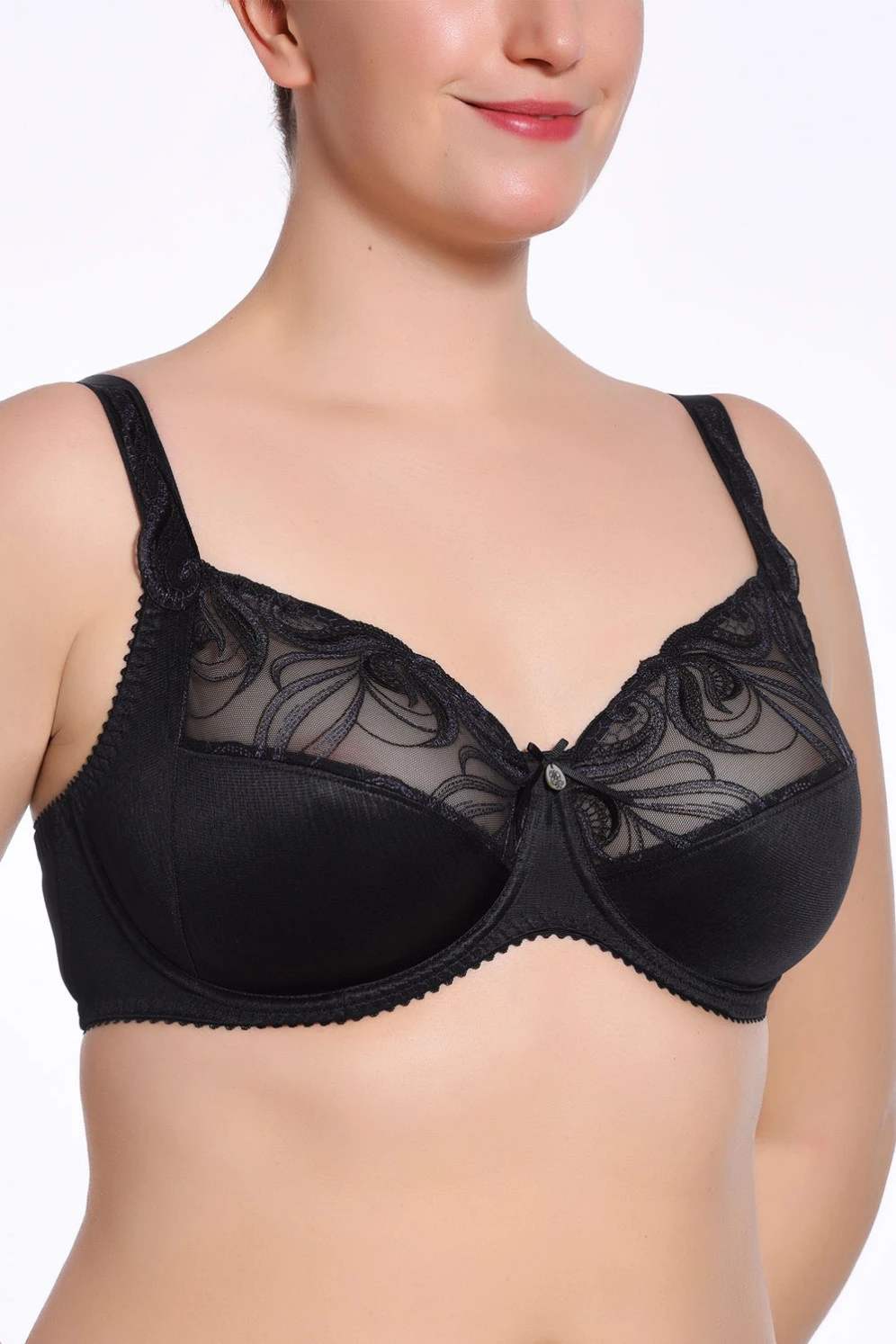 Wundervolle Weiblichkeit. Dieser edle Bügel-BH gibt dank seiner 3-geteilten Schnittführung mit waagerechter Teilungsnaht und seitlicher Blende optimalen Halt und Stütze bis Cup G. Im Obercup vereint das Dessous anmutige Stickerei und feine Transparenz. Blende und Unterschale sind formgebend aus festem Simplex gearbeitet. In Cupgröße F und G ist der BH im Rücken für zusätzlichen Halt doppelt unterlegt. Die Träger schmückt eine geschwungene Stickerei-Applikation. (Achtung! In der Farbe schwarz ist die Stickerei am Obercup zweifarbig – in Schwarz und einem dunklen Blau.)