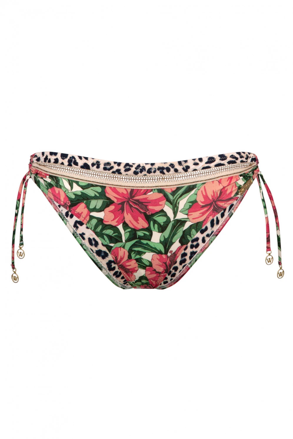 Bikini-Höschen mit seitlichen Tunnelzügen und Bindebändchen. Damit lassen sich Weite und Seitenhöhe in gewissem Maße regulieren. Der Slip ist bis auf die Bundgestaltung mit Futter in interessantem Dessin versehen, die Beinränder sind dehnbar versteppt. Wunderschöne Prints roter Hibiskusblüten und grüner Blätter werden durch Leotupfenstoff ergänzt. Dazwischen sorgt ein Bortenstreifen mit Goldgarn und durchbrochenem Muster für die edle Optik. Filigrane goldene Markenanhänger an jedem der vier Schnüre bilden reizvolle Details. Zudem wirkt das angenähte Watercult-Schildchen als Zierde.